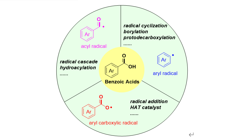 苯甲酸类化合物是一类非常重要的有机合成原料,具有来源广泛、廉价易得等优点。近年来,单电子(1e-)活化策略为苯甲酸类化合物的合成转化提供了一条有效途径。通过电催化、可见光催化或在一定的氧化剂存在下,苯甲酸可以选择性地转化为活性的羧基、芳基以及酰基自由基物种。基于这些活性自由基物种,发展苯甲酸参与的单电子反应可以有效克服传统双电子反应(2e-)具有的反应温度高、底物范围局限等缺点。
