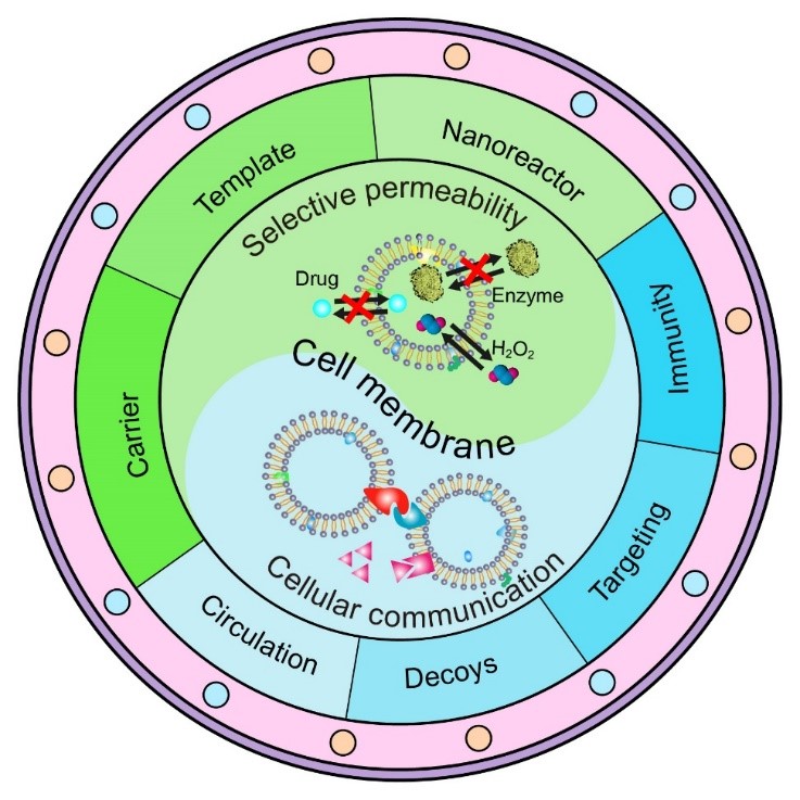 细胞膜的基本功能包括,具有选择透过性的物理屏障来保护细胞的完整性,同时允许营养物质和废弃物进出细胞,通过不同生物过程的细胞交流等。当细胞膜从细胞上分离下来并包覆在纳米材料上,活细胞中细胞膜的某些功能能够转移到细胞膜包覆纳米材料上。作者根据细胞膜的功能把细胞膜包覆材料分成两类:(1)细胞膜的选择透过性可使货物截留在细胞膜囊泡内,因而细胞膜包覆纳米材料可以作为药物载体或者纳米粒子合成的模板;同时细胞膜的选择透过性可允许一些物质(如过氧化氢)通过细胞膜,和封装在细胞膜囊泡内的生物酶或纳米酶进行反应,作为酶促纳米反应器。(2)细胞膜的交流功能能够赋予纳米材料:a. 在血液中长循环的能力,提高材料生物相容性;b.引诱有害生物分子吸附在细胞膜上的能力,从而中和毒素,可用于解毒,也可用于制备低毒的疫苗;c. 靶向病灶(肿瘤或炎症)的能力,可提高药物利用度,减少药物毒副作用;d. 调节免疫的能力,可用作肿瘤抗原疫苗引起抗肿瘤免疫,极化巨噬细胞增强免疫反应,模拟免疫细胞的功能,抑制免疫检查点减少杀伤性T细胞耗竭的功能。