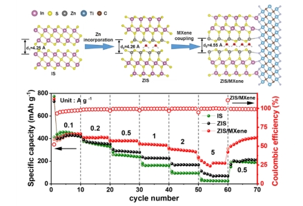 该工作提出了一种新型二维层状硫化铟(In1.95S3),并采用锌取代与MXene耦合的方法,旨在克服In1.95S3的导电性和循环稳定性差的问题。通过构建ZnIn2S4/MXene(ZIS/MXene)异质结构,以MXene片为基底,ZIS纳米片垂直生长,实现了钾离子(K+)的快速稳定传输和结构的完整性保持。水/甘油分子的插层以及ZIS与MXene之间的异质界面耦合显著增加了层间距,为K+扩散提供了更为高效的通道。实验结果和理论计算表明,锌的取代显著提高了In1.95S3的热稳定性,缩小了带隙,降低了K+的扩散阻力。这些改进使得ZIS/MXene负极展现出高可逆容量(0.1 A g-1时为424.5 mAh g-1)、卓越的倍率性能(5 A g-1时为185.2 mAh g-1)以及出色的循环稳定性(1 A g-1下1000次循环后容量保持率为84.8%)。原位和非原位表征结果揭示了ZIS/MXene负极遵循插层-转换-合金化反应机制,并伴随着从纳米片到纳米点的高度可逆形态转变。这项研究提出了一种新型的层状负极材料,该材料不仅增强了K+的扩散能力,还具有良好的结构稳定性,为开发高性能钾离子电池提供了一种有前景的解决方案。