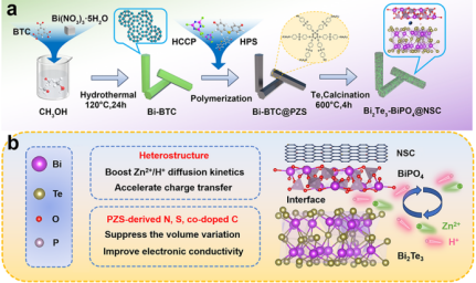 本研究以溶剂热法制备了Bi-1,3,5-苯三羧酸(Bi-BTC)纳米棒,并在Bi-BTC纳米棒上成功地包覆了聚磷腈层(表示为Bi-BTC@PZS),N2气氛中高温碲化得到了N, S共掺杂的多孔碳纳米棒(Bi2Te3-BiPO4@NSC)。通过构建具有内建电场的异质结构,显著增强了电极本征电导率,且多孔结构为Zn2+传输提供了更为高效的通道,有效地缓解了动力学缓慢和结构退化的问题。实验结果和理论计算表明,异质结电极具有较低的带隙,降低了离子扩散阻力。这些调控手段使得Bi2Te3-BiPO4@NSC展现出高可逆容量(0.2 A g-1时为458.2 m Ah g-1)、卓越的倍率性能及优异的循环稳定性。通过引入BiPO4诱导Zn2+和H+的吸附能协同增强,揭示了Zn2+/H+共插层的双离子存储机理。本研究构筑了一种新型的层状异质结阴材材料,为开发高性能、安全和稳定的锌离子电池提供了一种有前景的解决方案。