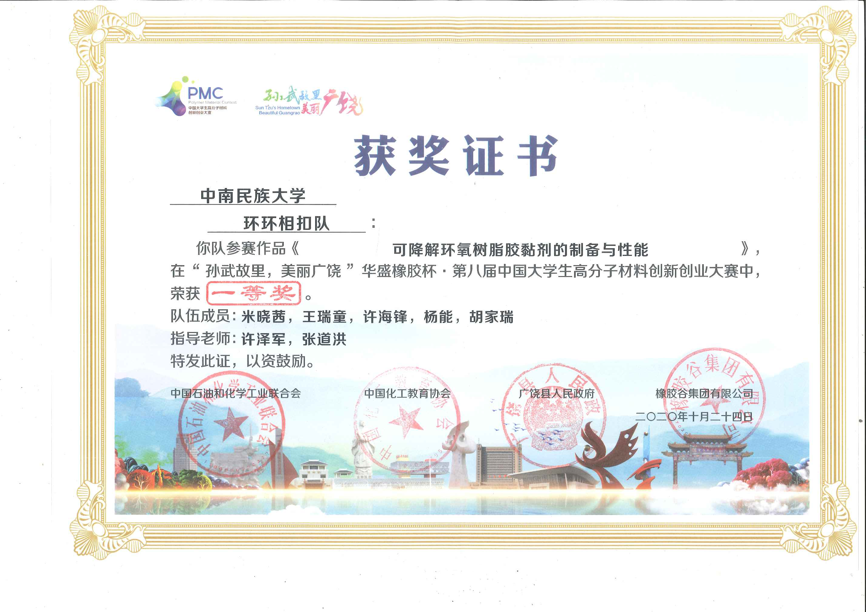 1 | 一等奖 | 可降解环氧树脂胶黏剂的制备与性能 | 米晓茜,王瑞童,许海锋,杨能,胡家瑞 | 许泽军 张道洪 |