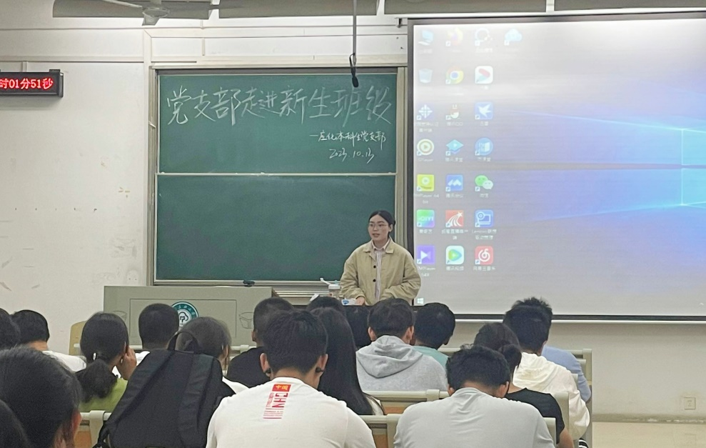 近期,为进一步加深2023级本科新生对中国共产党的理解和认识,引导新生积极向党组织靠拢,学院党委组织开展“党支部走进新生班级”活动,面向新生开展党的专题教育。10月13日晚,应用化学本科生党支部走进化学类2301班、化学类2302班,开展宣讲。