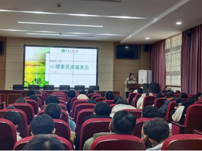 心理工作室王天雨同学解释了心理委员与寝室长的职责,强调了心理健康教育在校园文化建设中的重要地位,希望心理委员和寝室长们能够充分发挥自己的专长,关注同学们的心理健康,及时发现和解决同学们的心理问题,工作积极主动,和同学建立良好联系,尤其关注大一新生的适应性情况和大四考研就业学生的压力缓解。