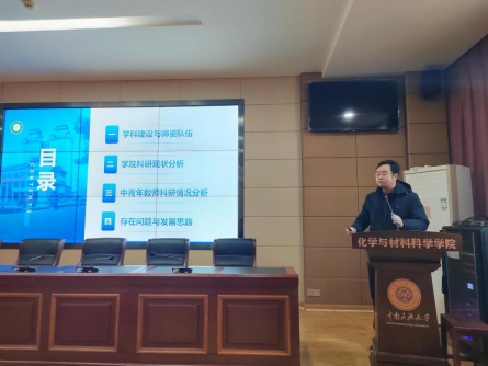 科研副院长王立围绕目前化学学科建设的现状、发展目标、青年教师整体情况以及面临的挑战等方面进行了总结分析,系统梳理了在人才培养、科学研究、师资队伍、社会服务、国际交流等方面优势与不足,就存在的问题和不足提出了建设举措与发展思路。