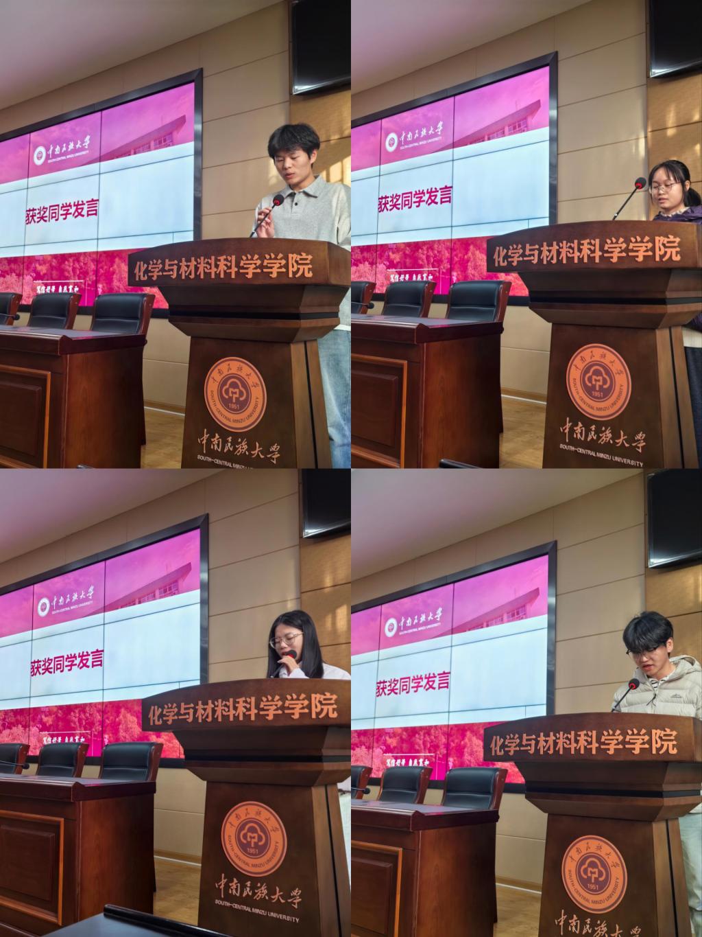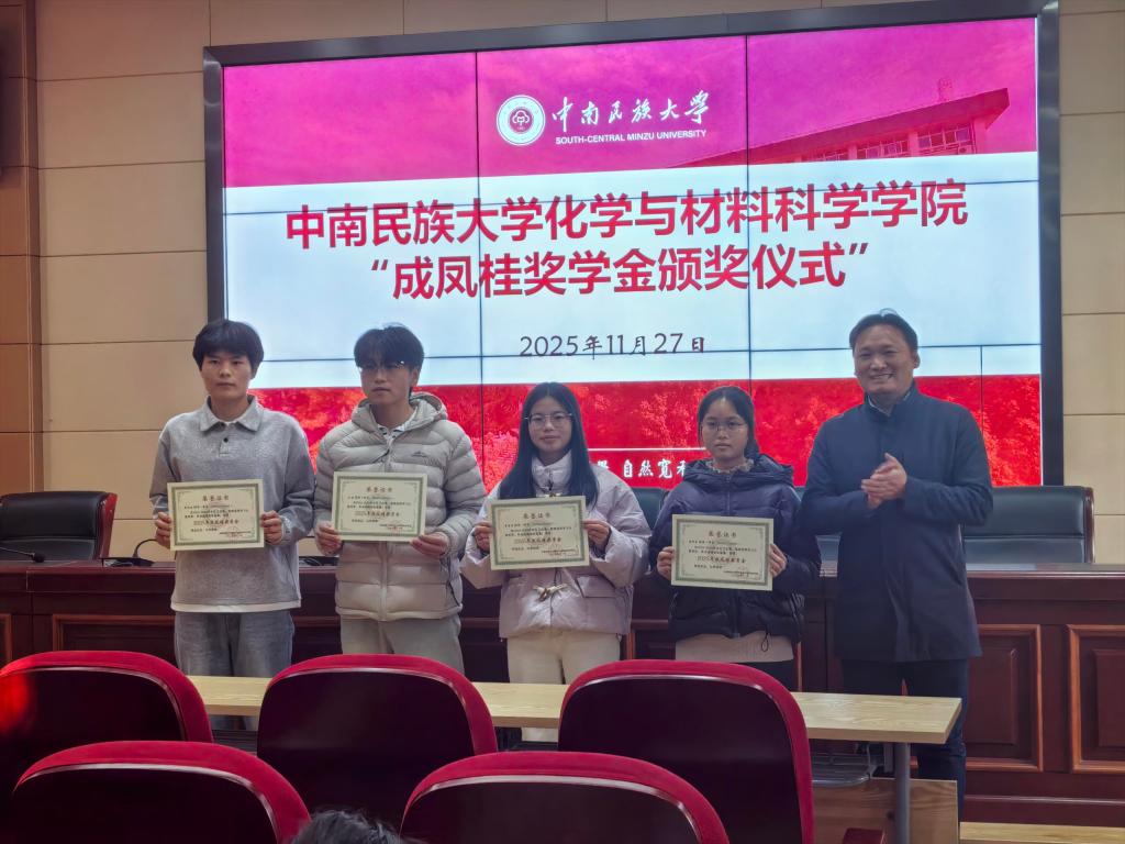 2025年11月27日下午,化学与材料科学学院在7号楼109会议室举行了“成凤桂奖学金”颁奖仪式,为2025年获得者进行颁奖。学院党委副书记钱红亮、2024级辅导员、获奖学生及学院勤工学生代表参会,张朝冲老师主持。