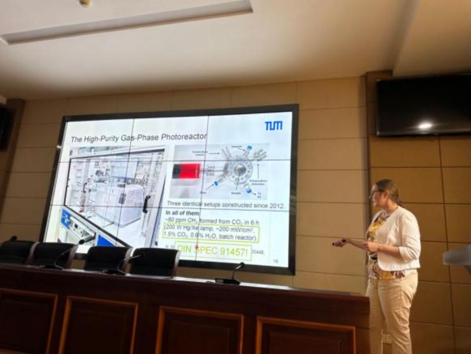 报告第二部分详细地介绍光催化还原二氧化碳。Jennifer Strunk教授利用高纯度气相光反应器和红外光谱技术,揭示了TiO2 P25在反应过程中的许多机理细节。主要产物CH4只能通过涉及C2中间体(如乙酸或乙醛)的途径形成,而C1机制只能导致CO形成。光强烈影响二氧化碳的吸附,这可能是第一个基本步骤。尽管含碳产物的形成明显来自二氧化碳,但氧气不会逸出,而是储存在TiO2体中。用放氧共催化剂改性TiO2,可以得到能够在气固系统中整体分解水的光催化剂,但不会形成含碳产物。令人惊讶的是,从二氧化碳到甲烷的反应途径不是后续的还原事件链,还涉及光生空穴,因此这两个半反应在TiO2上是不可分割的。解吸限制可能是产物量有限的另一个原因。总之,需要新的材料组合(如Z方案)来正确分离半反应。此外,她建议进行光热联合催化反应,而不是室温下的纯光催化反应。对于后者,使用工业型Cu/ZnO/Al2O3催化剂取得了有希望的结果。报告结束后,Jennifer Strunk教授同在座师生就光催化反应中存在的问题和挑战进行了讨论和交谈。
