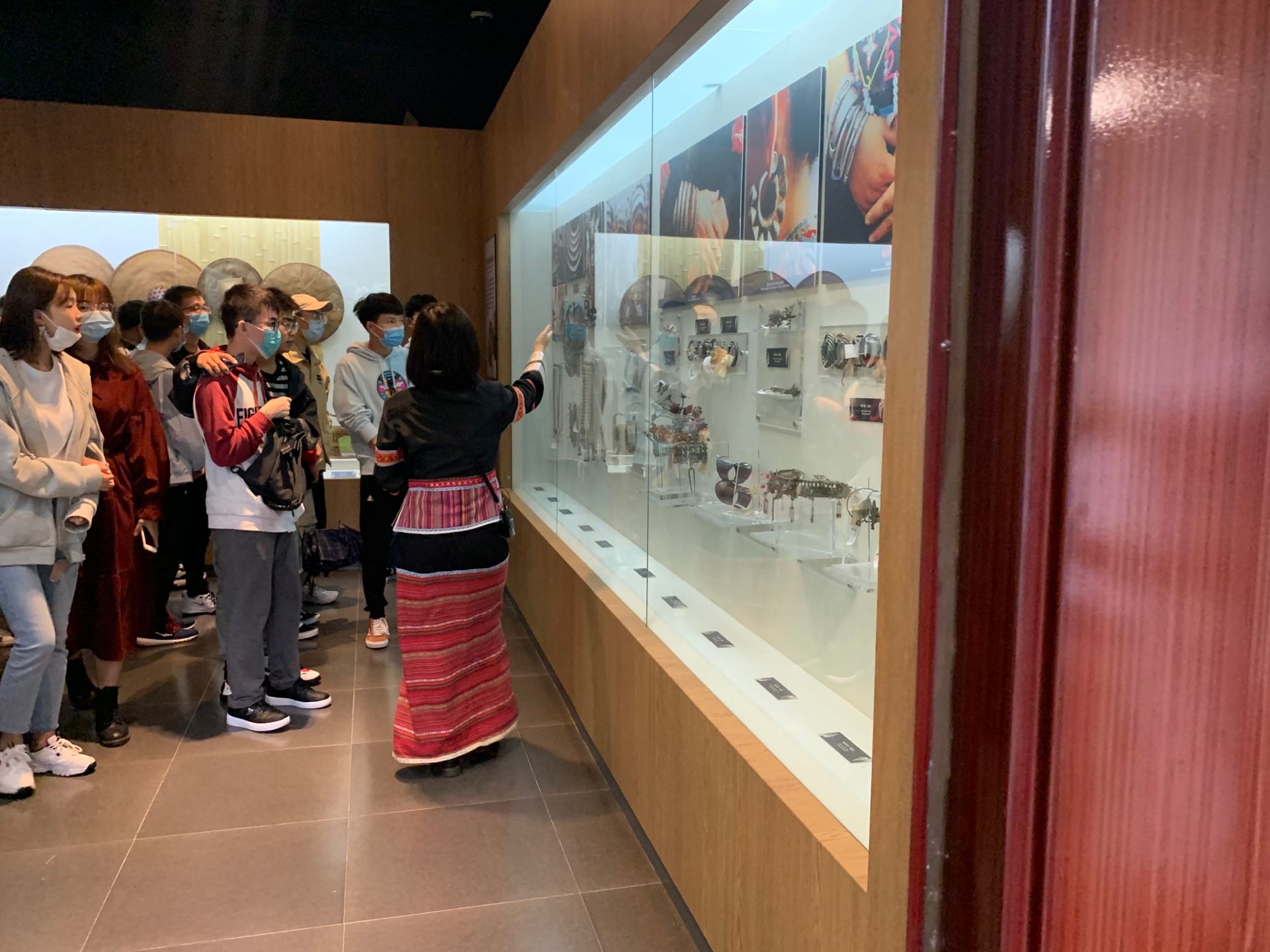 最后,解说员带领同学们来到最后一个展厅--斑斓霓裳的少数民族服饰展,里面有壮,侗,黎,苗,土家等民族特色服饰,各民族服饰个性张扬,色彩鲜明。