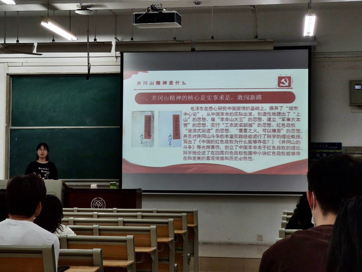 孔艳介绍了井冈山精神是什么,井冈山精神的核心是实事求是,敢闯新路;井冈山精神的灵魂是坚定信念,艰苦奋斗;井冈山精神的基石是依靠群众,勇于胜利。而我们作为新一代青年更应该学习和传承井冈山精神,筑牢理想信念之基,大力弘扬艰苦奋斗精神,坚持脚踏实地的学习态度,同时也要有敢于闯新路的创新精神。之后由张文灿为我们介绍了女性革命家们为建设新中国、中国共产主义革命事业的探索中做出的不可磨灭的贡献。最后滕香莹带领同学们一起探索了中共五大的历史。中共五大在党史画下了浓重一笔:第一次提出要争夺对民主革命的领导权;第一次强调在南方坚持和发展革命根据地;“五大”虽没能完成从危难中挽救革命的使命,但却是年轻的中国共产党探索中国革命道路艰难历程中的一个重要环节,在党的历史上首次选举产生了中纪委的前身——中央监察委员会。