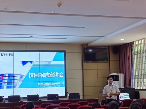 9月21日下午14:00,惠州亿纬锂能股份有限公司2023年秋季校园招聘会在化材院一楼大楼会议厅顺利举行,由亿纬锂能人力资源部贵先生主讲。