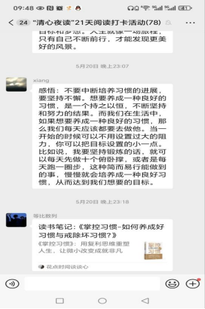 活动期间,参与者每日在微信群完成打卡,分享书中的精彩片段或个人感悟。坚持撰写读书笔记,促进了深度思考。微信书评专栏成为思想碰撞的舞台,展现了学生们对习惯养成理论的深入理解。