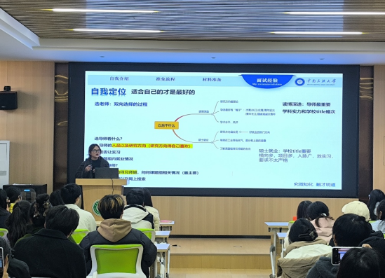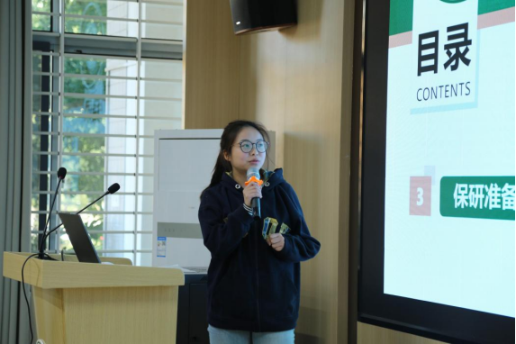 应用化学专业谈诗雅(保研至厦门大学)围绕“院校匹配与材料准备”,介绍如何利用官网、论文定位研究方向,并演示个人陈述中突出科研经历与学科优势的方法,鼓励同学“不为考试而学习”,主动拓展学科前沿。