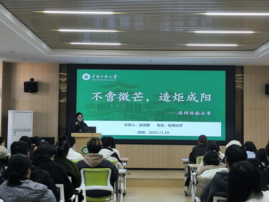 2025年11月29日上午,威尼斯886699“南湖新声讲坛”第十三期——化学与材料科学学院保研经验分享会,在学校“一站式”学生社区总站荷香会客厅举行。活动由2022级辅导员王奎老师主持,邀请4位2022级成功保研学生进行经验分享,吸引众多低年级同学参与。