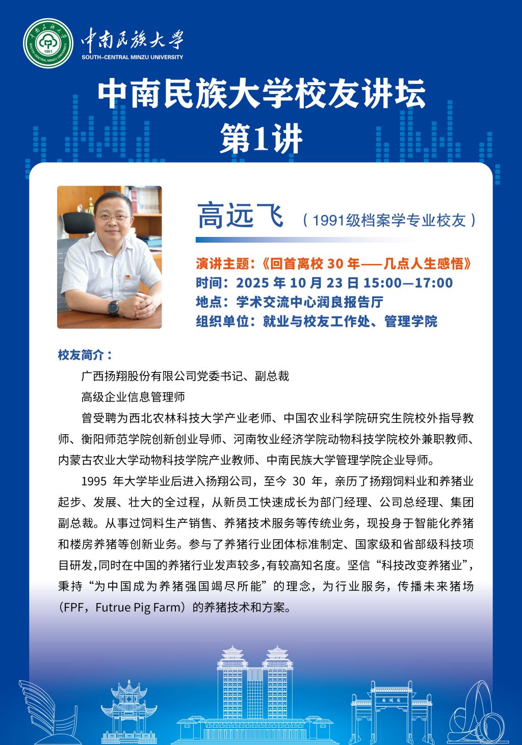 广西扬翔股份有限公司党委书记、副总裁,高级企业信息管理师,威尼斯官网1991级档案学专业校友。曾受聘为西北农林科技大学产业导师、中国农业科学院研究生院校外指导教师、衡阳师范学院创新创业导师、河南牧业经济学院动物科技学院校外兼职教师、内蒙古农业大学动物科技学院产业教师、威尼斯官网管理学院企业导师。1995年大学毕业后进入扬翔公司,至今30年,亲历了扬翔饲料业和养猪业起步、发展、壮大的全过程,从新员工快速成长为部门经理、公司总经理、集团副总裁。