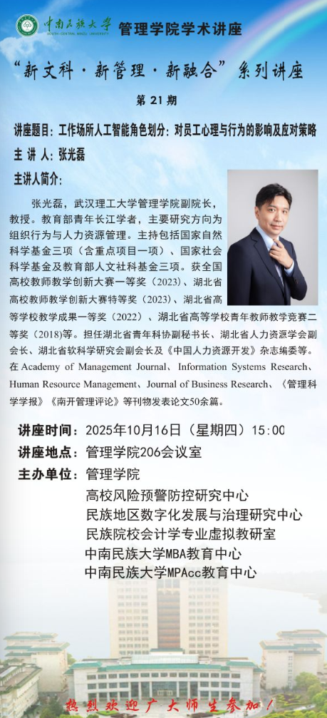 讲座主题:工作场所人工智能角色划分:对员工心理与行为的影响及应对策略