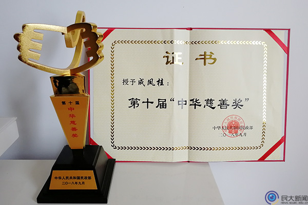 成凤桂教授的老伴欧老师受民政部邀请,亲往北京,在人民大会堂替她领取了这份殊荣。欧老师表示,获得慈善奖有特殊的精神意义,这份精神可以传递且不断增长,而学生是国家未来的希望,为师之责任就是要为国家培养人才尽自己的绵薄之力。