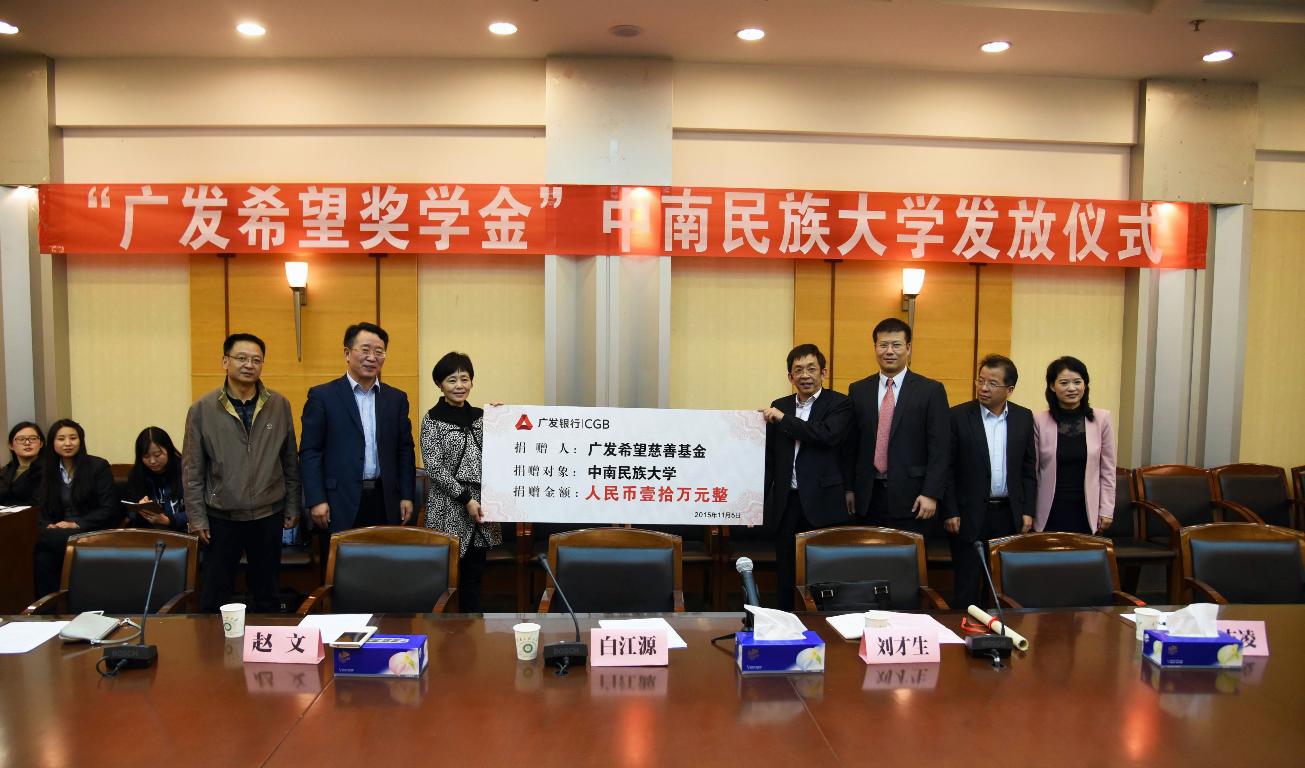 201511月5日,“广发银行希望奖学金”发放仪式在威尼斯官网学术交流中心举行。广发银行党群工作部副部长刘才生、武汉分行纪委书记庞志凌,威尼斯官网领导白江源、赵文及学工部、团委、校教育发展基金会秘书处、校友会办公室、财务处等相关部门负责人出席仪式。仪式由校团委书记江莹主持。