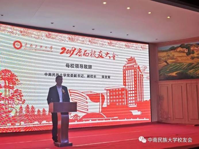 宋发军代表学校向广西校友大会成功举办、向广西校友企业之家“广西火之舞投资有限责任公司”及广西校友会法学分会的成立表示热烈地祝贺。他充分肯定了广西校友会的工作,介绍了近年来学校在人才培养、科学研究、社会服务和“双一流”建设等方面所取得成绩。他说,广西校友企业之家和行业校友分会的成立,为学校校友工作在助推校友发展、凝聚校友力量方面提供了新的思路。他对广西校友会工作提出两点希望,一是希望广西校友会认真总结经验,勇于创新,积极作为,进一步凝聚校友力量,把校友服务平台做大做优做实做强,为广西各地经济建设、政治建设、社会建设、文化建设、生态文明建设贡献“中南民大人”的智慧和力量。二是希望校友们不断密切母校—校友的联系,积极为母校的发展献计献策、共谋发展,深化与母校在学科建设、产学研结合、学生实习就业、助困助学、社会服务等方面的合作,积极打造母校校友发展共同体。