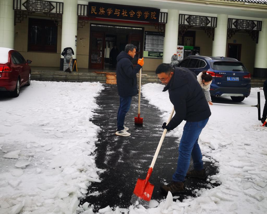 一起干、加油干!民族学与社会学学院师生积极投身“铲雪除冰”行动