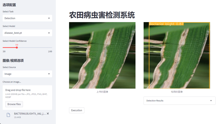 杨杨同学的论文题目为《An Improved YOLOv8-Based Rice Pest and Disease Detection》。他的研究工作关注现阶段的基于深度学习的方法对农作物病虫害检测存在检测精度低、速度慢、部署困难且漏检率高的问题,提出了一种改进的病虫害检测模型 YOLOv8-HSFPN。图1为该模型在水稻病虫害上的识别结果;图2为基于该模型设计并开发的基于Web端的农田病虫害检测系统,方便相关人员通过网络便捷、实时进行农田病虫害识别和监测。