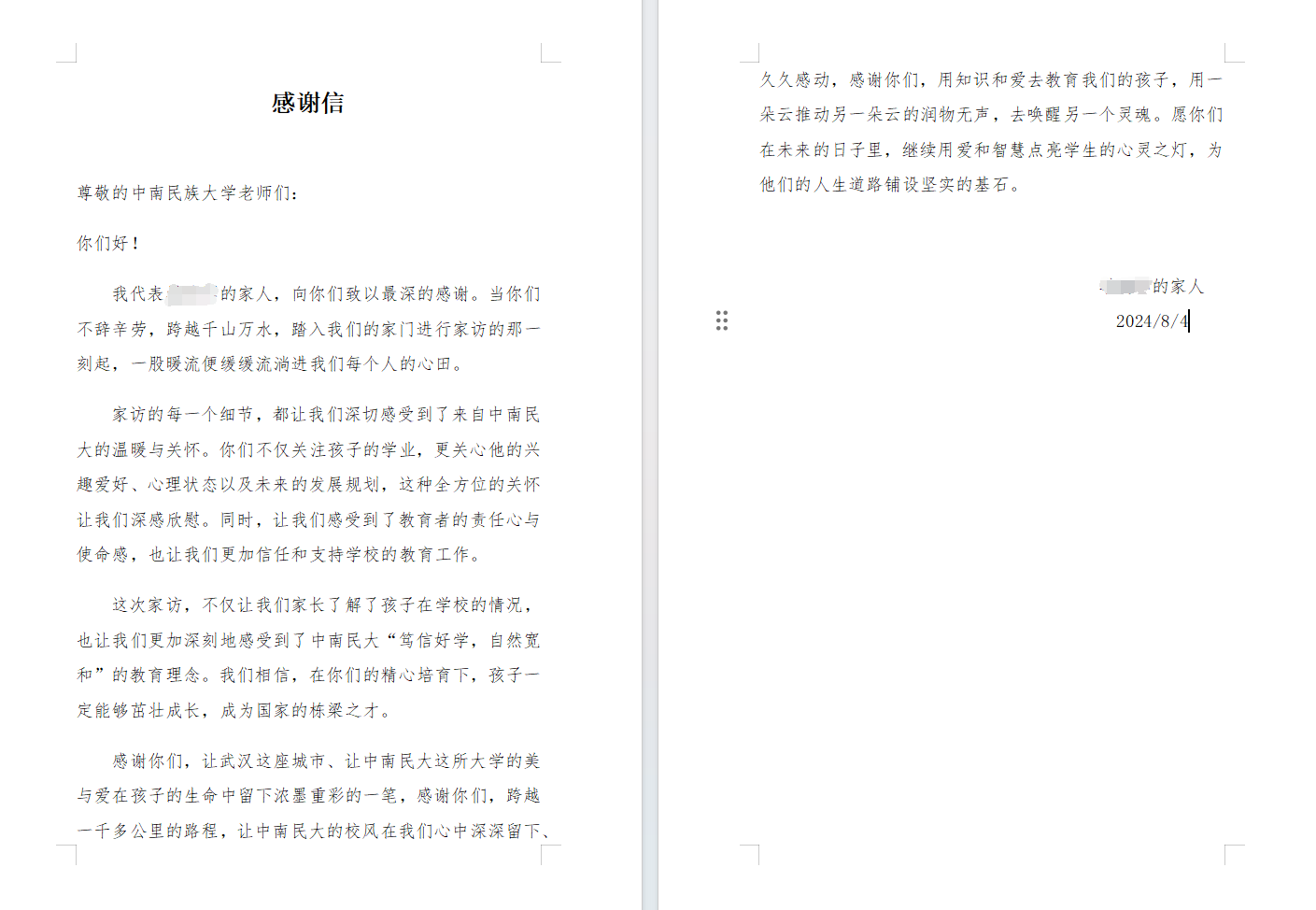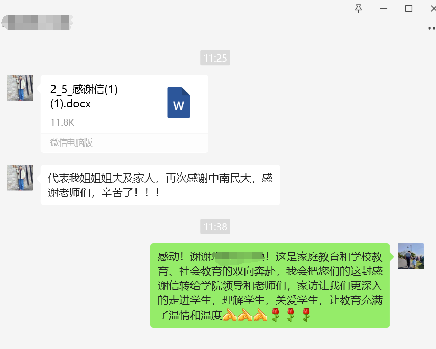 家访结束后,学生家长特意写了一封感谢信,他们在感谢信中深情感叹:“家访的每一个细节,都让我们深切感受到了来自中南民大的温暖与关怀。你们不仅关注孩子的学业,更关心他的兴趣爱好、心理状态以及未来的发展规划,这种全方位的关怀让我们深感欣慰。同时,让我们感受到了教育者的责任心与使命感,也让我们更加信任和支持学校的教育工作。”