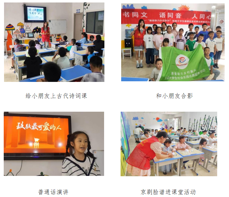 实践活动期间,团队成员在独山县百泉镇翁奇村、中华社区、井桥社区3个站点共开设课程120余节,授课学生100余人。上课期间,团队经过精心设计和安排,开设了普通话特色课程、普通话朗诵演讲比赛、你画我猜游戏以及京剧脸谱进课堂等一系列别开生面的推普活动,这些活动给当地学生们带来了全新的体验。在课堂上,通过与小朋友们积极互动,有效提升当地学生的普通话水平,促进语言文字交流,为乡村振兴贡献青年力量。
