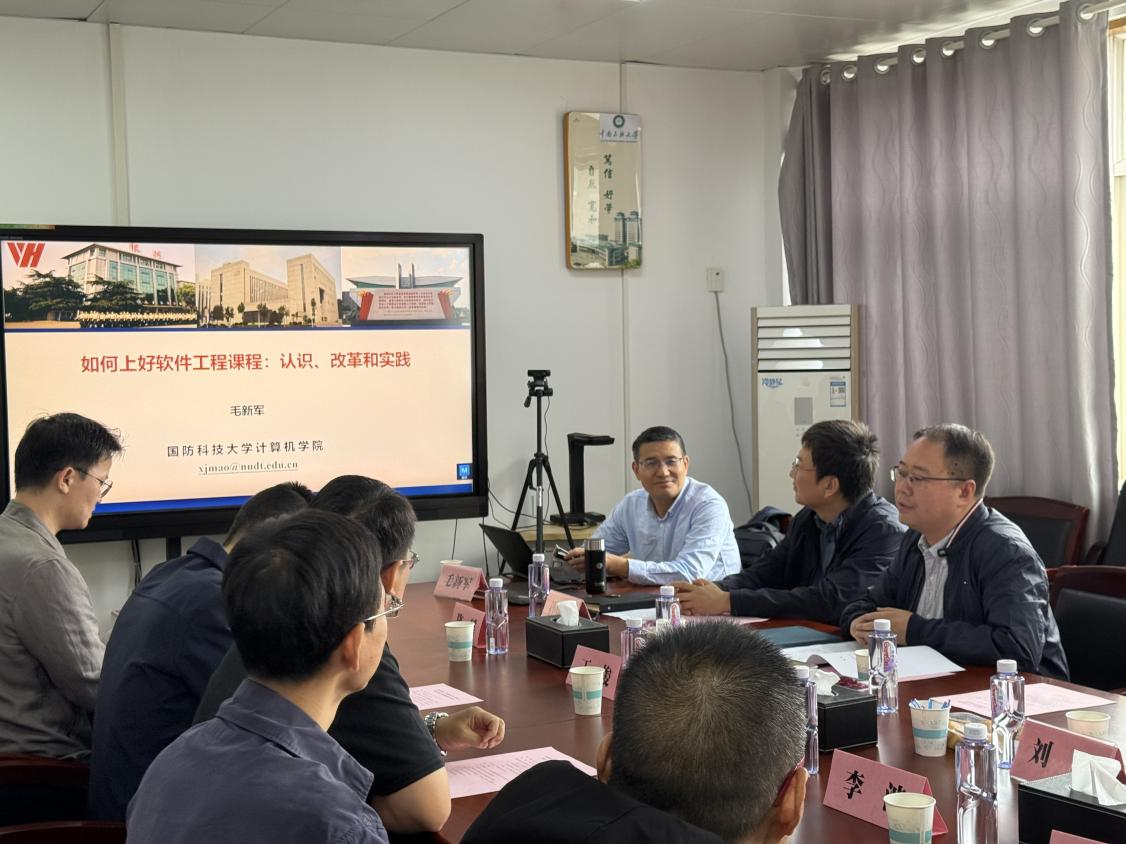 此次研讨会特邀教育部“101计划”工作组核心专家、“101计划”《软件工程》课程及虚拟教研室负责人、CCF教育专委副主任、信息技术新工科产学研联盟实践教学工委主任、国防科技大学首席教授、博士生导师毛新军教授开展“101计划”背景下《软件工程》课程建设的专题研讨。毛新军教授从教学理念、教学方法、课程实践、教材建设、数字化教学资源平台建设几个方面进行了全方位的深度指导,为软件工程课程建设的系统性、前沿性、实践性的提升提供权威思路与实施方案。本科生院副院长刘晶,学院院长帖军、副院长孙阳光、软件工程系主任彭川、副主任陈瑶及相关专业骨干教师代表参会,会议由孙阳光主持。