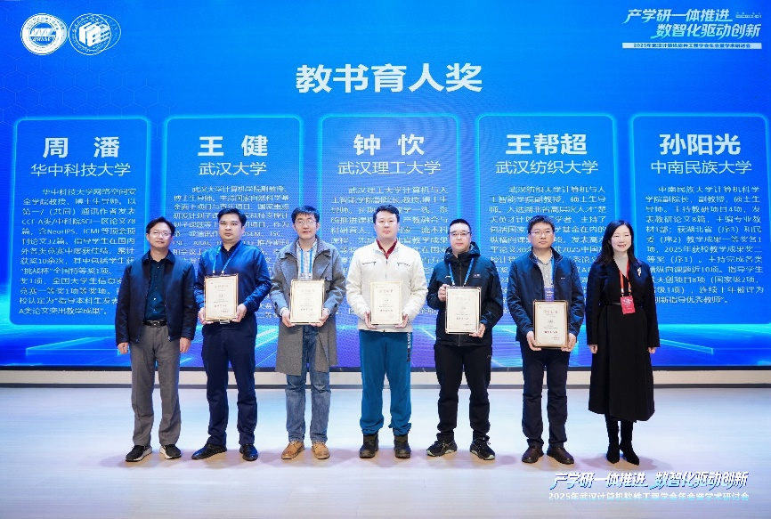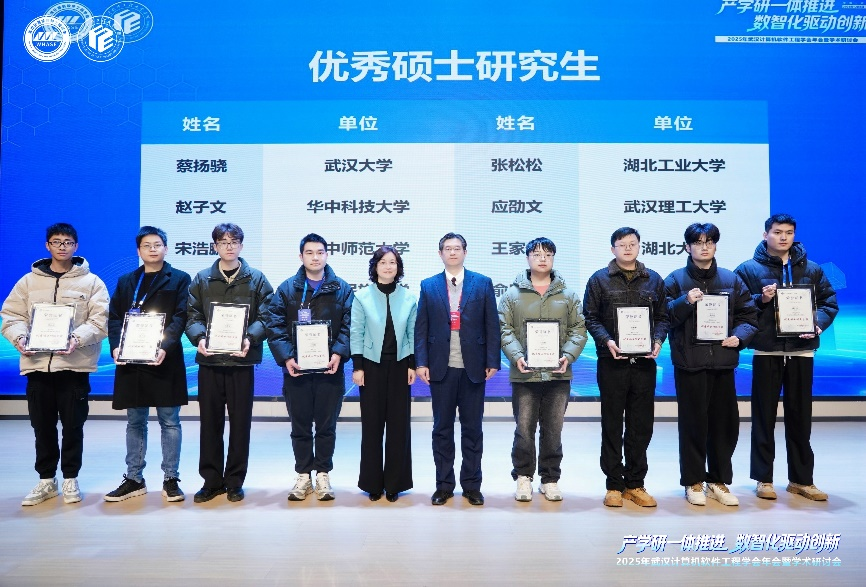 开幕式后,武汉计算机软件工程学会副理事长、威尼斯886699计算机学院(人工智能学院)帖军教授主持了2025年度学会颁奖仪式,现场颁发了杰出成就奖、卓越服务奖、青年才俊奖、教书育人奖、优秀博士学位论文奖及优秀硕士研究生奖。其中,我院孙阳光老师荣获“教书育人奖”,戴仁可同学荣获“优秀硕士研究生奖”。