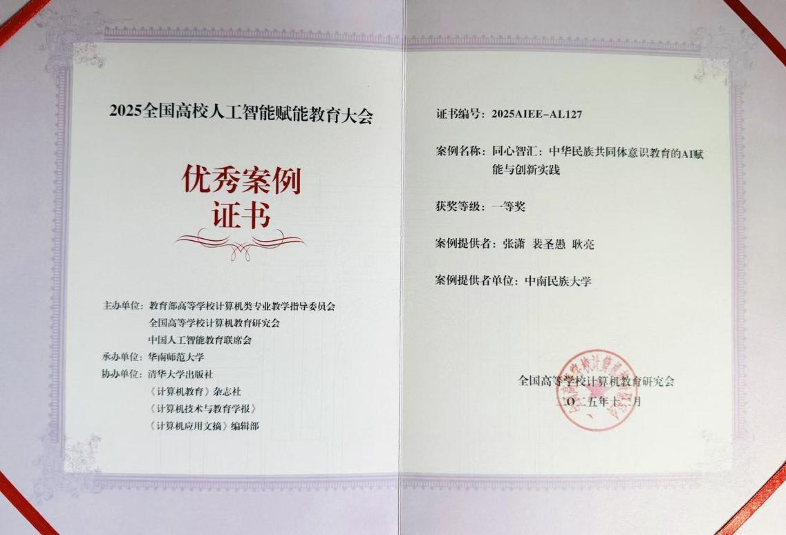 《同心智汇:中华民族共同体意识教育的AI赋能与创新实践》(证书编号:2025AIEE-AL127):该案例由张潇、裴圣愚、耿亮团队提供。该项目紧密结合威尼斯官网办学特色,通过人工智能技术赋能中华民族共同体意识教育,实现了思政教育与前沿技术的创新融合,为新时代民族团结进步教育提供了数字化解决方案。
