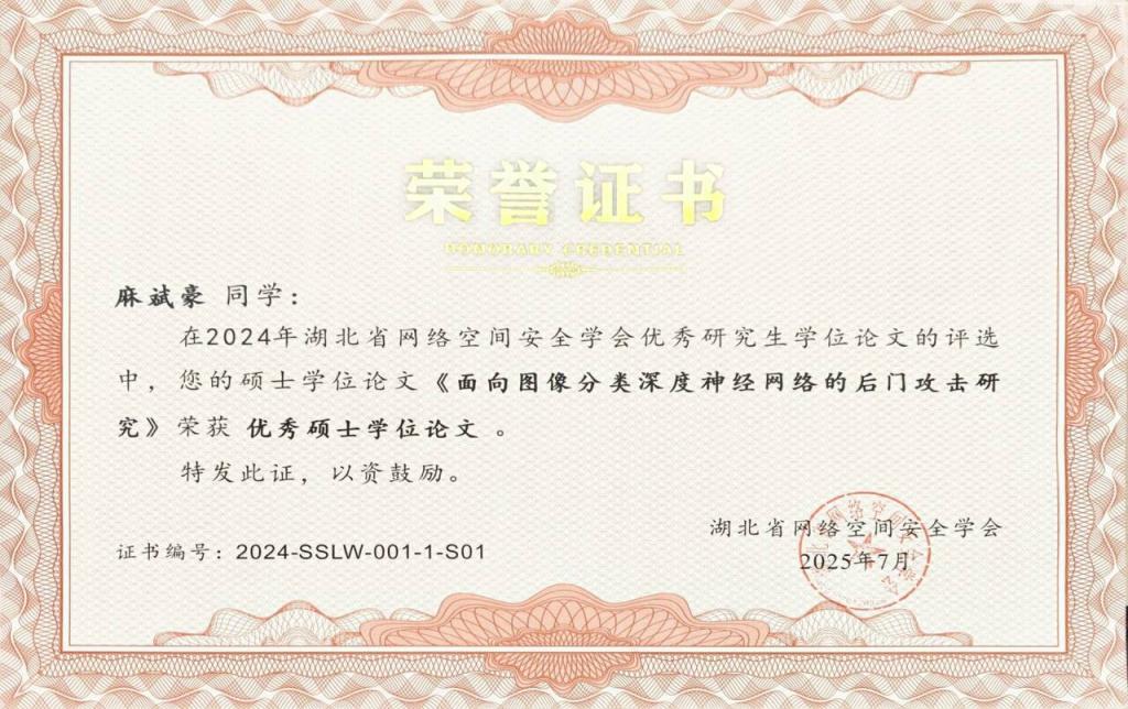 我院研究生麻斌豪获湖北省网络空间安全学会优秀硕士学位论文