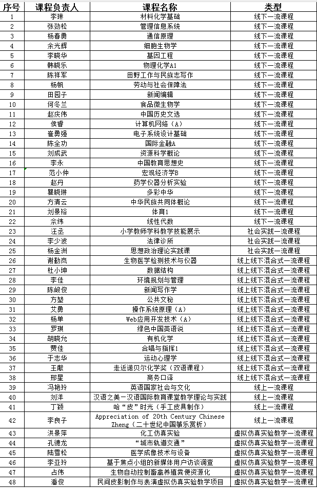 根据学校《关于开展第三批国家级一流本科课程预申报工作的通知》安排,按照《教育部办公厅关于开展第三批国家级一流本科课程认定工作的通知》(教高厅函[2023]24号)精神要求,经个人申报、学院推荐、学校组织评审及综合评议,同意推荐以下48门课程项目申报第三批国家级一流本科课程。课程名单如下: