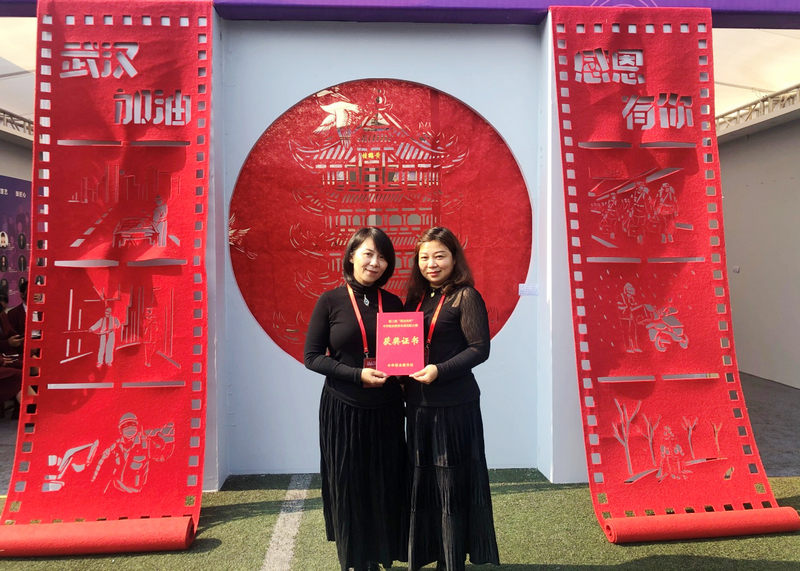 《武汉,我们在一起》大型抗疫剪纸作品以武汉的地标——黄鹤楼剪纸为中幅,辅以6类人群的6个精彩瞬间(解放军集结武汉、雷神山火神山建造者、医护人员陪老人看夕阳、党员下沉志愿者消杀和宣传,雪中外卖小哥、坚守岗位的环卫工),以记录式的电影胶片形式进行呈现,向党和全国各族人民传达黄鹤无恙,武汉感恩的情怀!全国人大常委会副委员长、民建中央主席、中华职业教育社理事长郝明金等领导人亲临观摩参赛作品,并给予高度的评价和赞扬!