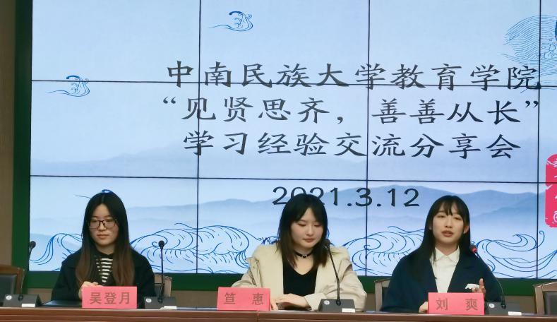 为帮助同学们正确认识自我,掌握高效学习方法,明确未来发展方向。3月12日晚,我院于15栋教学楼特别举办“见贤思齐,善善从长”学习经验分享会。本次活动特别邀请到教育学17级学生吴登月、教育技术学17级学生刘爽和应用心理学17级学生笪惠为大家答疑解惑,辅导员谭闺臣老师进行总结点评。