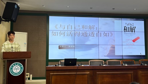 活动开始,粟思畅同学就《与自己和解:如何活得通透自如》一书展开分享。他介绍了作者利伯曼所提出的“PERMA”情绪管理路径,并结合实际案例,阐释了如何通过增强觉察力、管理期望和接纳现实等途径,达成与自我的和解。
