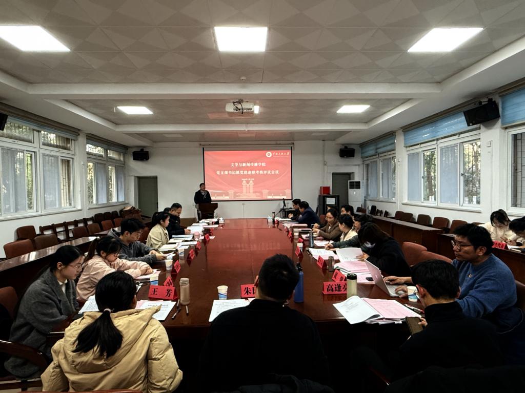 (通讯员朱民辉 摄影曾令建)2026年1月13日下午,学院召开2025年度基层党支部书记抓党建述职评议会。学校党建述职评议督导组成员唐光海、张荔芳,文学与新闻传播学院“两委”委员,学院各基层党支部书记,师生党员代表参加会议。会议由学院党委书记钱文彬主持。