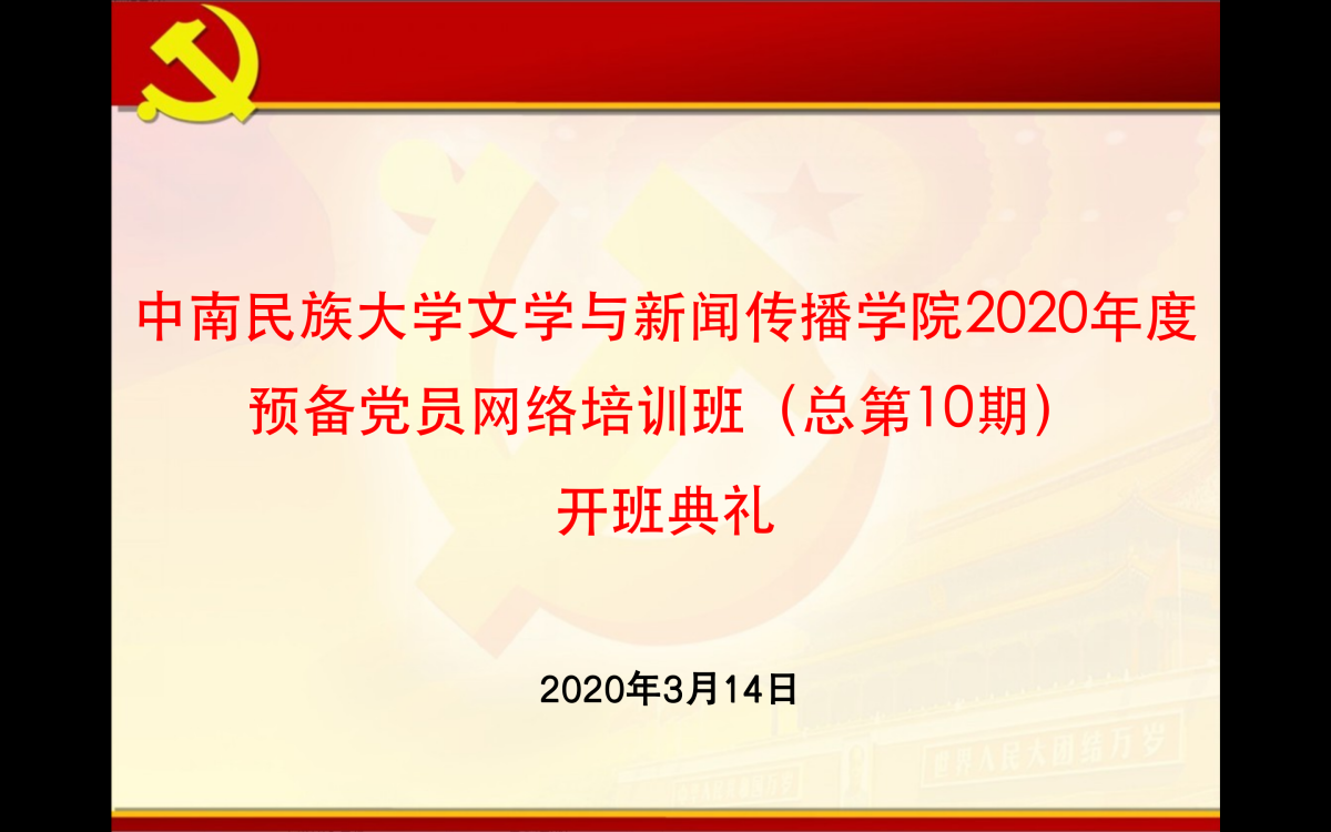 本站讯(通讯员 古昕)3月14日上午10时,威尼斯886699文学与新闻传播学院召开2020年度预备党员网络培训班(总第10期)开班典礼。为贯彻疫情期间相关政策要求,此次开班典礼在腾讯会议网络平台进行。我院党委书记韩昕、党委副书记张文军、专职组织员伍岚、团委书记、培训班带班老师阿达来提以及本期全体预备党员参与了这次开班典礼。