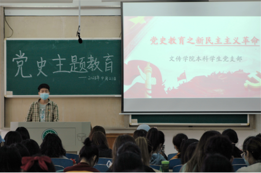 会上,雷联迎就新民主主义革命时期的重大历史事件进行了详细讲解,从中国共产党成立到新中国成立,党经历了由幼稚蜕变成熟的过程。从国共第一次合作到南昌起义、从八七会议到红军长征、从遵义会议到抗日战争、从土地革命到解放战争,种种事迹深刻诠释了“没有共产党就没有新中国”的道理。雷联迎提出,新时代背景下,同学们仍要继承党的红军精神、革命精神,坚定党的理想信念,拥护党的纲领,遵守党的章程。全体党支部成员应做到听党话、跟党走,对党忠诚,积极进取,向优秀党支部看齐,成为优秀党员。