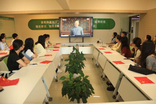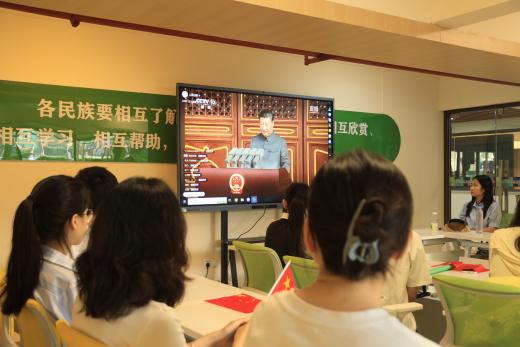 上午9时,大会准时开始,天安门广场上礼炮轰鸣,国旗护卫队步伐铿锵。全体师生跟随奏唱中华人民共和国国歌,现场气氛庄重严肃。与会师生全神贯注观看直播画面,认真聆听习近平总书记重要讲话。