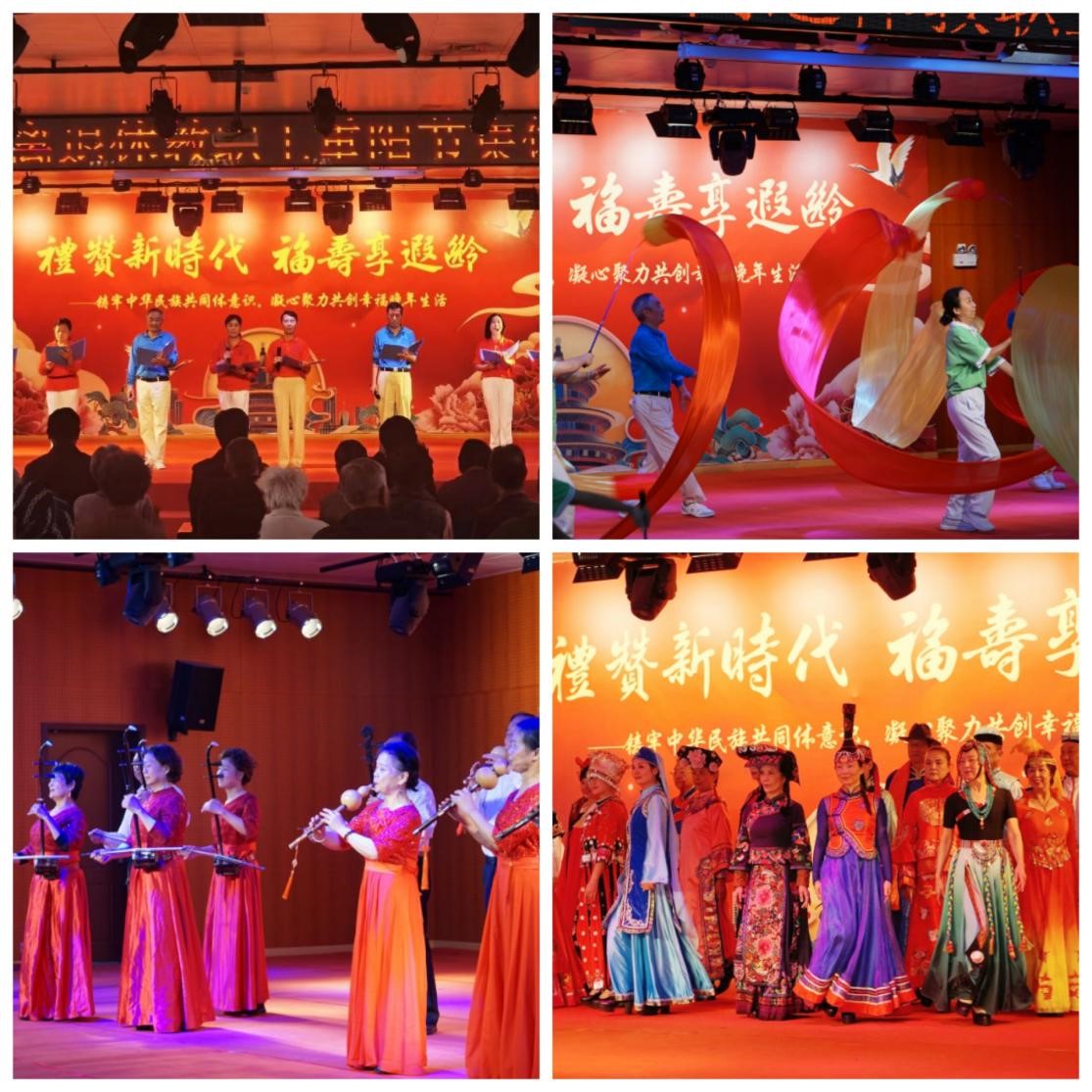 祝寿会上,离退休工作处老年文体团队表演了精彩的文艺节目。老年武术队带来长绸健身舞《今天是你的生日》,新时代活力感与幸福感伴着欢快的旋律溢满全场。齐唱团结奋进旋律、共筑和谐幸福生活,琴之韵和丝之韵艺术团演出的葫芦丝二胡齐奏《再唱山歌给党听》丝琴合奏,弦承优美。“变老的时候,一定要变好,”欣雅朗诵艺术团一首诗朗诵《变老的时候》引起会场共鸣。最后,由民族之花模特艺术团带来了精彩的形体时装展示《锦绣中华》,共舞民族团结,奏响华彩乐章,将庆祝活动推向高潮。