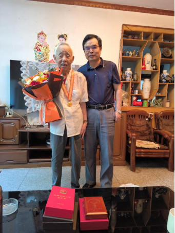 校党委书记徐业勤为抗战老同志谢洪义颁发“中国人民抗日战争胜利80周年”纪念章