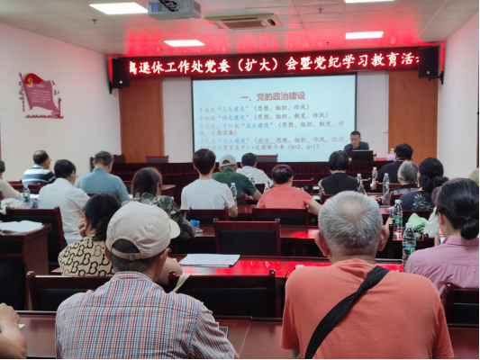 6月27日上午,离退休工作处在东区教职工活动中心召开党委(扩大)会暨党纪学习教育活动学习会,校党委组织部常务副部长、离退休工作处处长周刚同志讲授专题党课。离退休工作处党委委员、全体党支部委员、处全体工作人员参加了本次会议。会议由离退休工作处党委书记张文军主持。