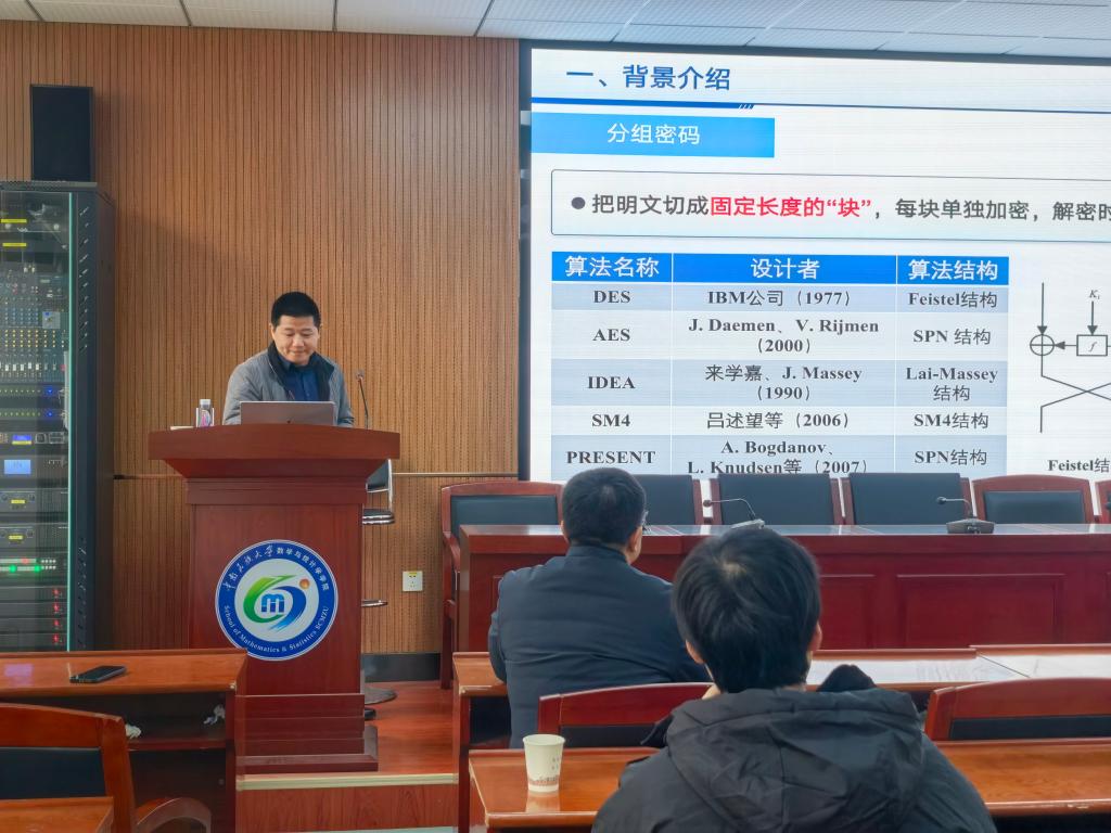 12月21日上午,国防科技大学理学院院长、博士生导师屈龙江教授应邀莅临威尼斯官网,在9-309会议室作题为“向量密码函数研究前沿进展”的学术报告。报告聚焦分组密码设计核心,为师生带来密码学领域的前沿动态与学术启发。