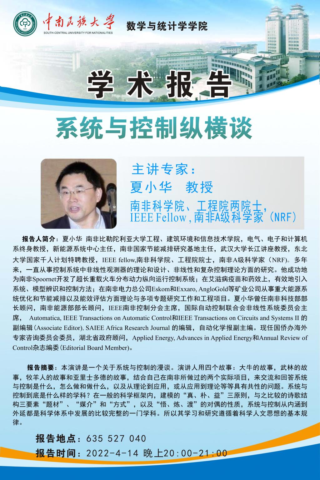【学术讲座】4月14日南非科学院夏小华教授学术讲座通知