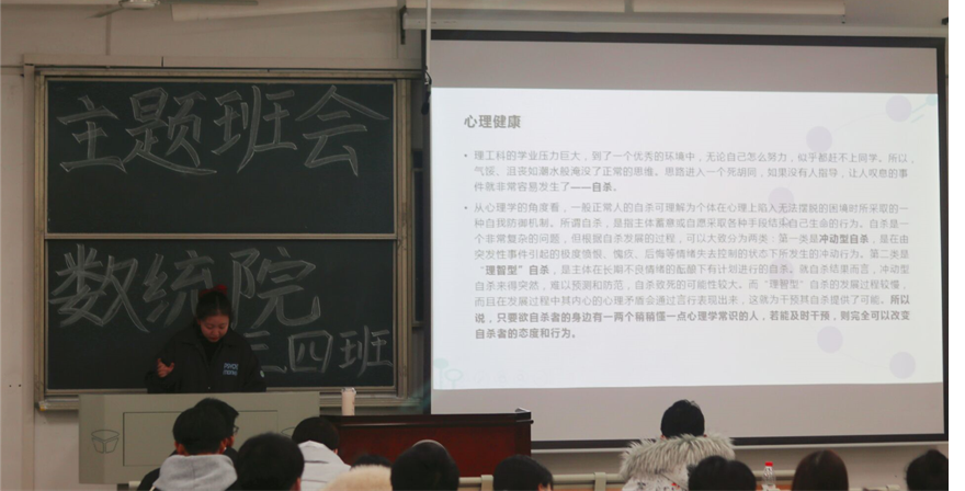 心理健康方面,各班代表通过列举自杀案例,让同学们了解了自身可能出现的不同心理状况,提醒同学们控制自己的情绪,通过合理的方式调节情绪,关注自身心理状况,做一名心理健康的大学生。
