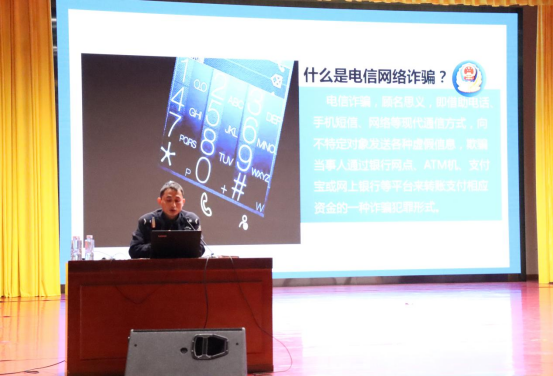 为提高同学们的安全防范意识,筑牢全院师生安全思想防线,我院于4月6日晚在学术会堂开展了防范电信网络诈骗专题讲座,学院师生共同聆听了此次讲座,学院党委副书记郭琳老师主持讲座。