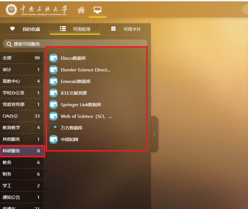 2、认证成功后,在左侧“可用应用”选项卡中查找“科研服务”,点击相关电子数据库资源即可直接进入 查询 或 下载 电子资源(无需使用VPN认证),如下图所示: