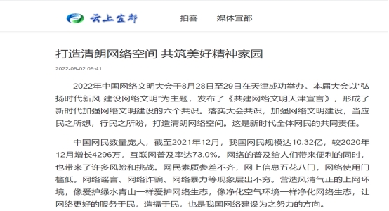 该文章以2022年举办的中国网络文明大会中发布的《共建网络文明天津宣言》为出发点,分析如今网络生态现状,结合十八大以来党中央对网络文明建设的重视,解读出新时代网络文明建设的重要性,呼吁社会各界持续发力,打造清朗网络空间,共建网上美好家园,争当做好新时代的好网民。全文如下: