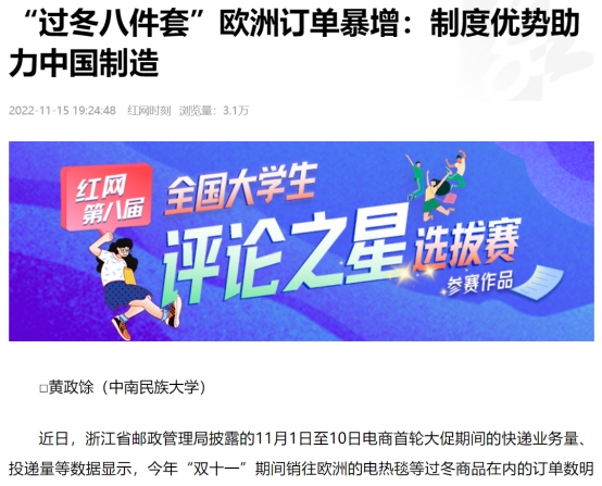 11月15日,我院思想政治教育专业2021级本科生黄政馀同学在湖南省主流媒体“红网”上发表题为《“过冬八件套”欧洲订单暴增:制度优势助力中国制造》的评论文章。这是我院“南湖评论”团队在省媒发表的第四篇文章。