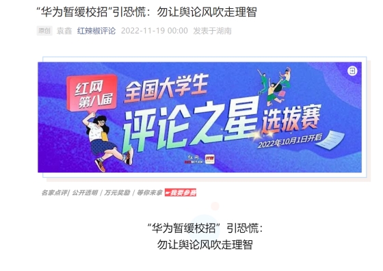 11月19日,我院思想政治教育专业20级本科生袁鑫同学在湖南省主流媒体“红网”上发表题为《“华为暂缓校招”引恐慌:勿让舆论风吹走理智》的评论文章。袁鑫同学是我院“南湖评论”团队专业课程思政实践育人平台中的成员。这是我院思想政治教育专业本科生在省级主流媒体发表的第六篇评论文章,文章登上了红网红辣椒评论首页,并被红辣椒评论公众号推送,进入了月赛。