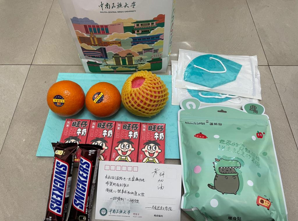 2022年12月14日,在2023届全国硕士研究生招生考试即将到来之际,我院再次开展“浓情暖心、一研为定”助力考研活动,为考研学子精心准备“考研加油包!每份加油包饱含着学院满满的祝福:苹果,“苹”安顺利;橙子,“橙”功上岸;暖宝宝,温“暖”予你;旺仔牛奶,做上岸的仔;士力架,能量满满,以及手写考研祝福语的民大马院明信片和考生需要的N95的口罩等暖心礼品,饱含着学院对考研学子的温暖与爱,一句句加油鼓劲的话语,凝聚着深深的祝福与期许!