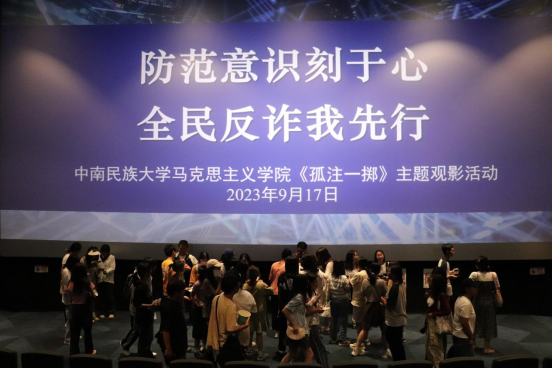 为切实增强新生识骗防骗的意识和能力,引导新生紧绷防范之弦,远离诈骗之害,9月18日晚,我院组织2023级全体本科生、研究生集体观看反诈题材电影《孤注一掷》。院党委书记汤振华、党委副书记李建青、学工办主任金瑶、研究生辅导员陈梦妮和兼职辅导员石锦参加了观影活动。